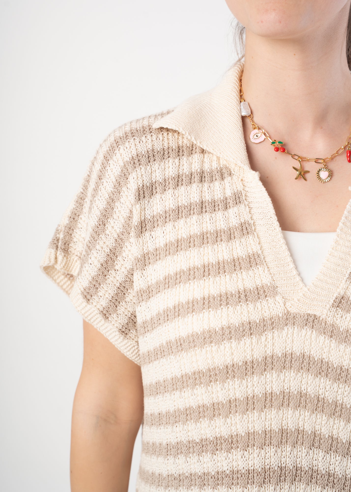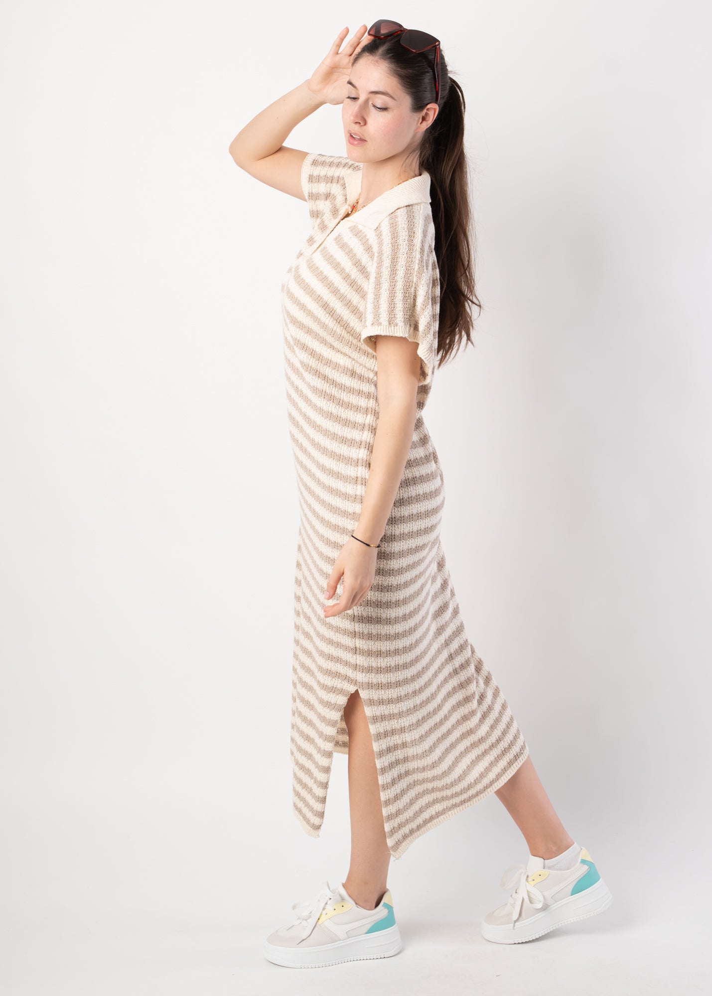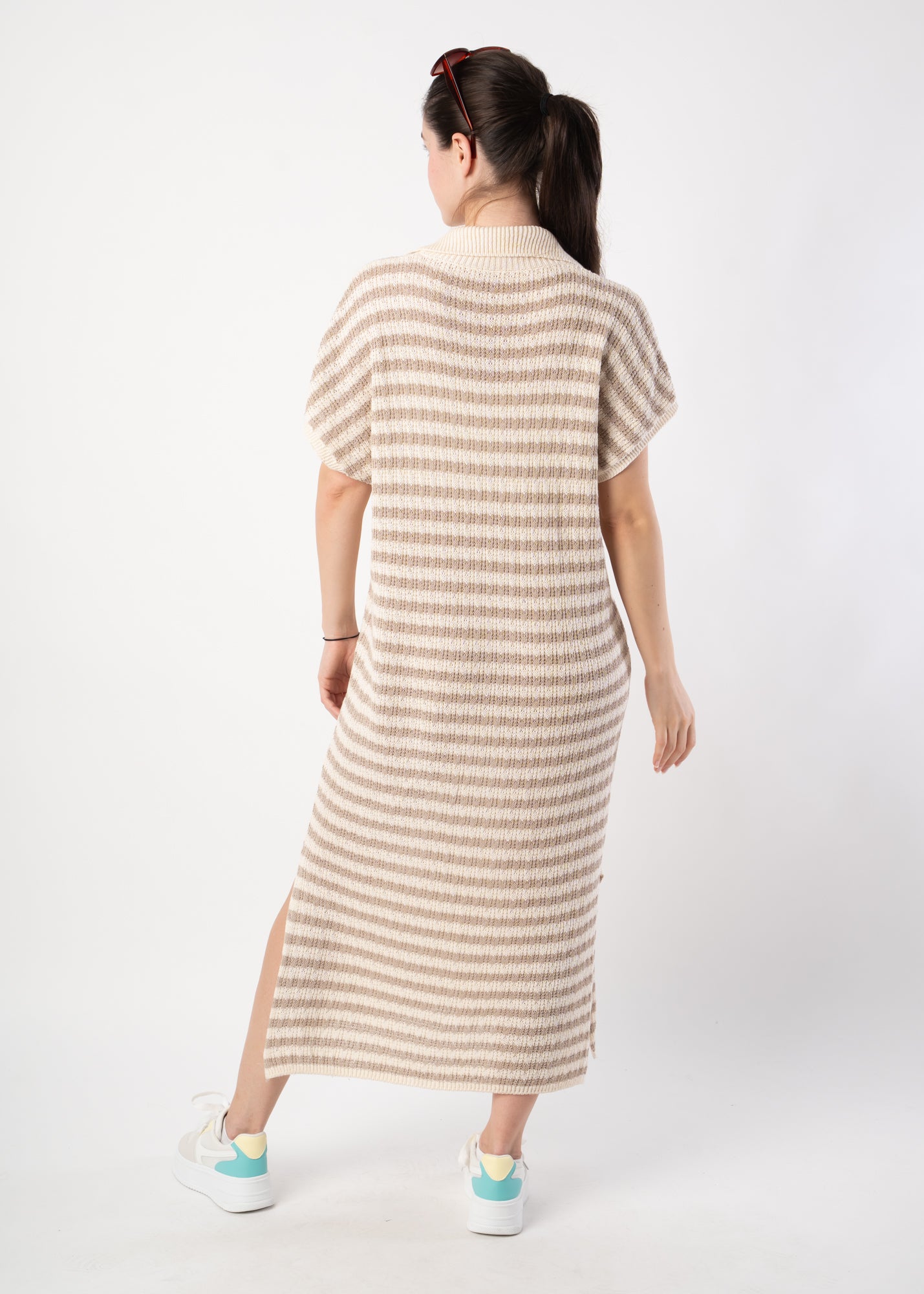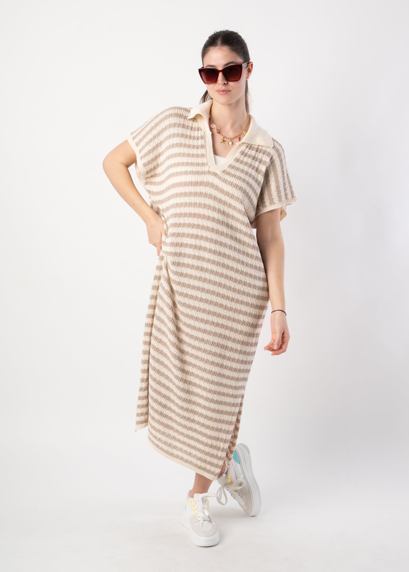Dieses lange Häkel-T-Shirt-Kleid in Beige hat kurze Ärmel und einen klassischen Polokragen, was ihm eine lässig-elegante Note verleiht. Das luftige Muster und der gerade Schnitt machen es perfekt für sommerliche Tage – entspannt, leicht und stilvoll.