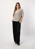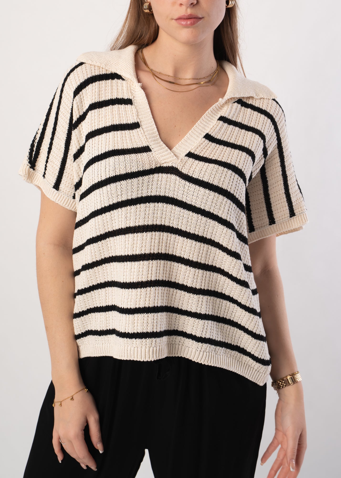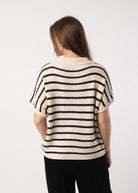 Dieses Strick-T-Shirt mit feinen Streifen und charakteristischem 90s-Polo-Kragen versprüht lässigen Retro-Charme. Der weiche Strick sorgt für ein angenehmes Tragegefühl, während der Schnitt deinen Look casual und trotzdem angezogen wirken lässt – perfekt für entspannte Sommertage mit Stil.