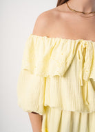 Lässig und romantisch – dieses Musselinkleid kombiniert ein Rock mit einem Off-Shoulder-Oberteil samt zarter Blumenstickerei. Die feine Faltung verleiht dem Look Leichtigkeit und femininen Charme – perfekt für warme Sommertage.