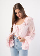 Eine Bluse wie ein Statement – mit verspielten Volants, vielen Rüschen und zarten Falten aus transparentem Mesh. Leicht und perfekt für besondere Sommermomente.
