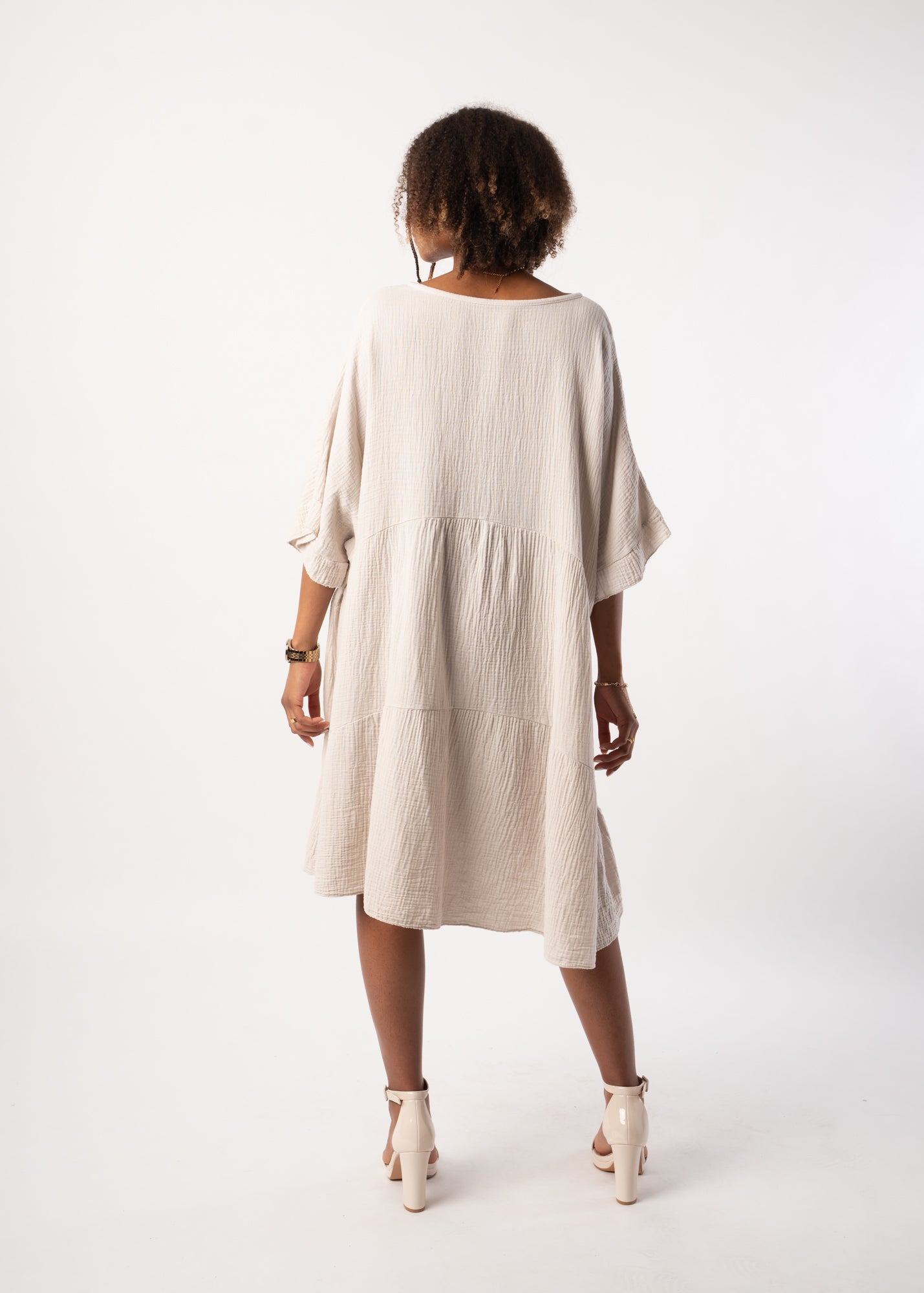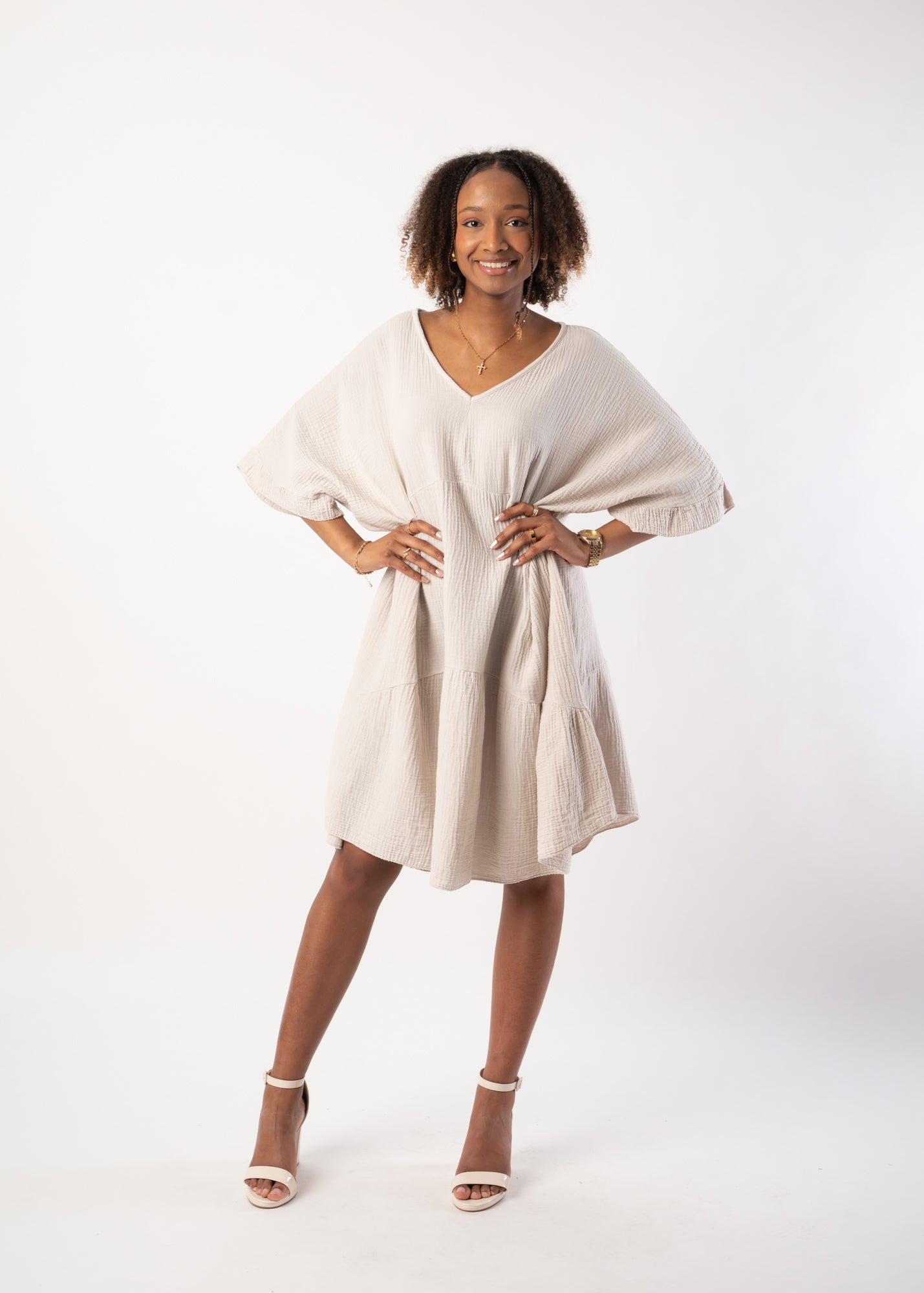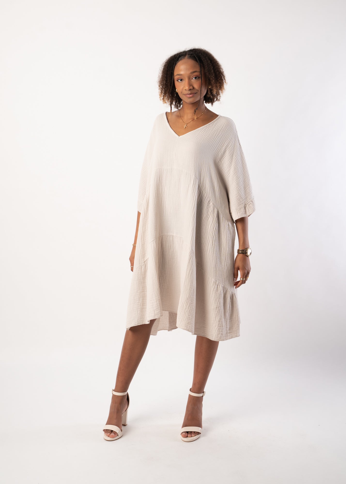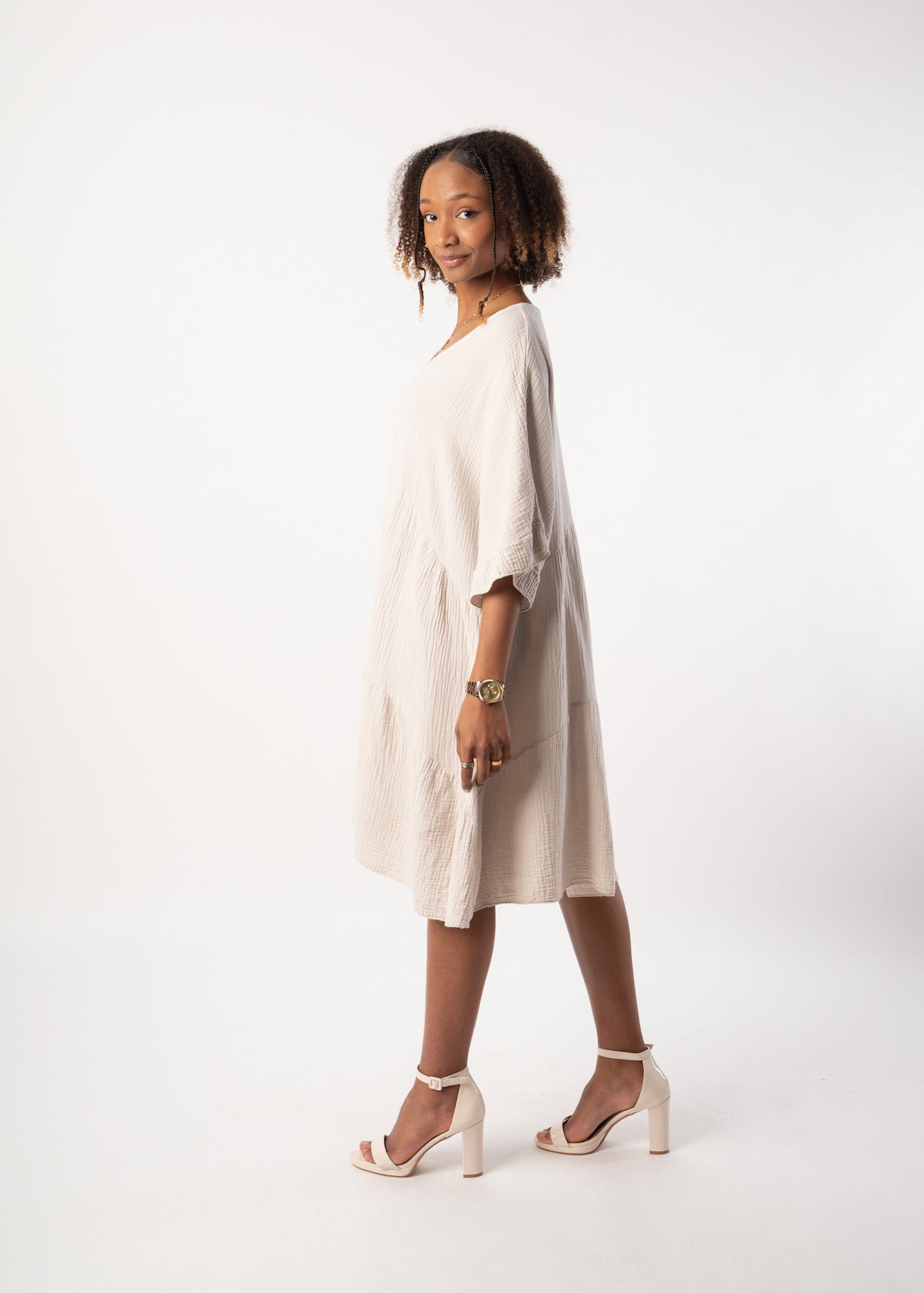 Luftig, locker und einfach schön – dieses weit geschnittene Baumwollkleid mit leichtem V-Ausschnitt und kurzen Ärmeln ist dein Sommer-Essential. Ob lässig am Strand oder mit Gürtel gestylt für den City-Look – vielseitig und angenehm zu tragen.