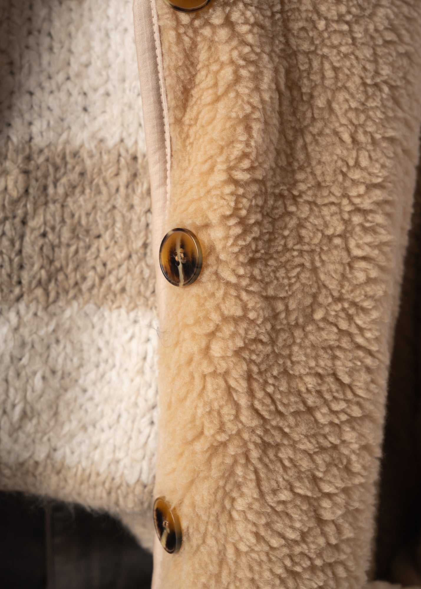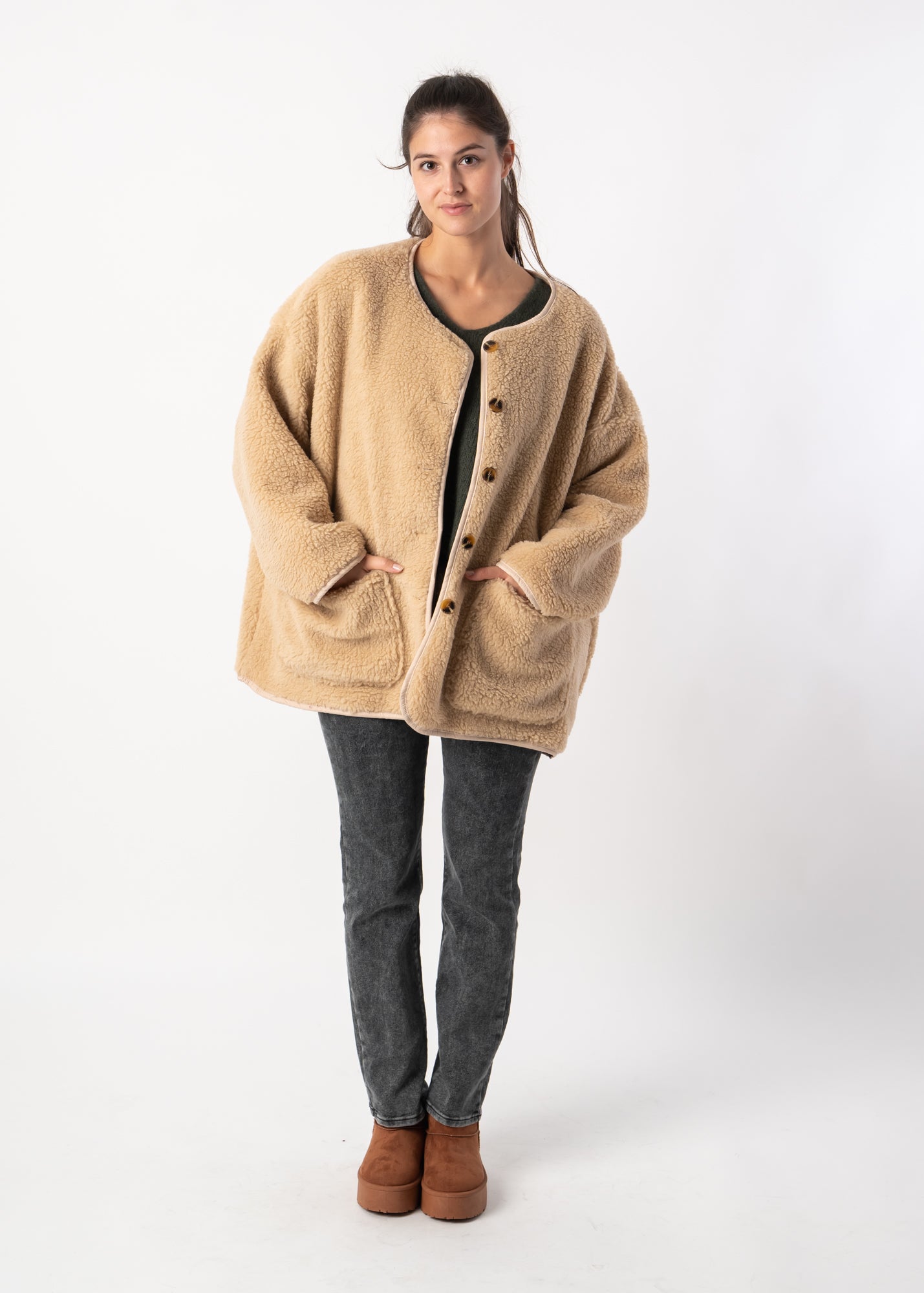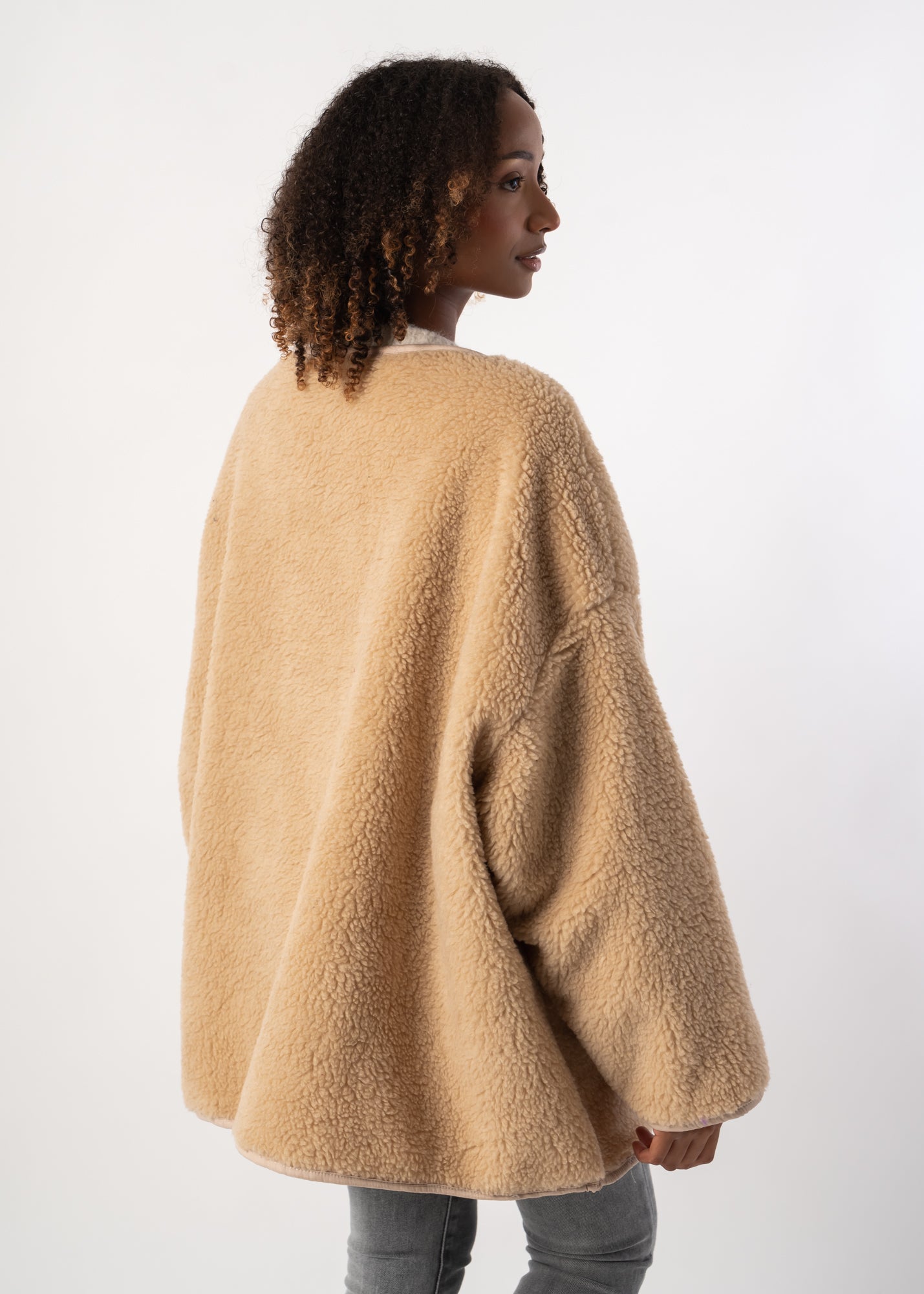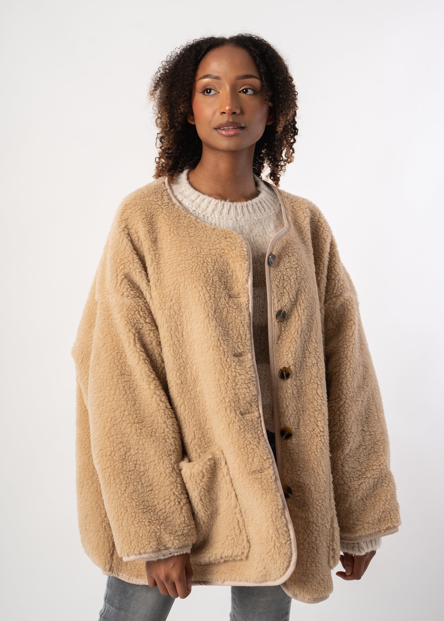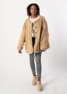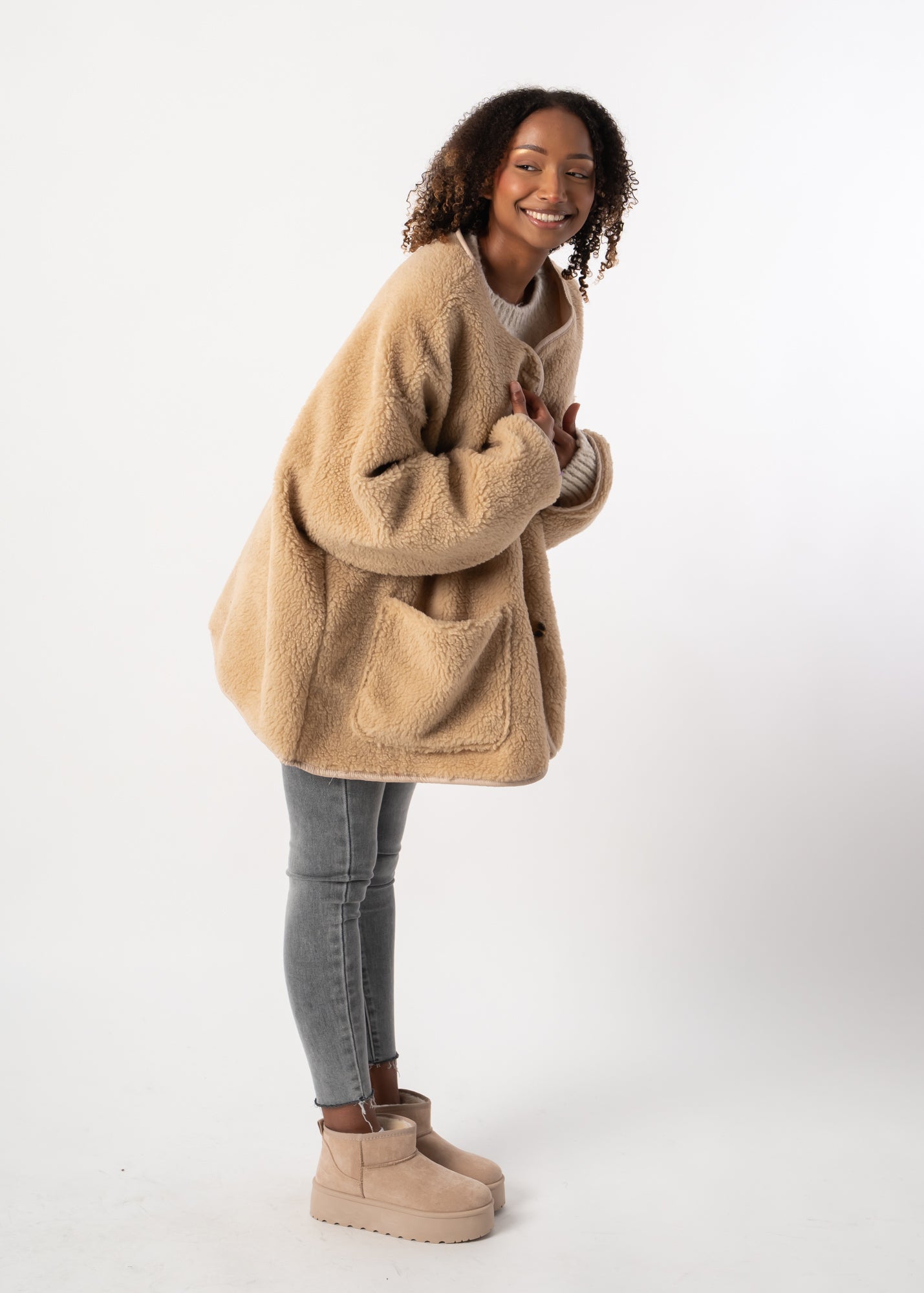 Diese Oversize Teddyjacke ist das perfekte Piece für alle, die es warm und cozy mögen. Das flauschige Bouclé-Material trifft auf einen lockeren Schnitt und praktische Details wie Knopfleiste und Taschen – so wird sie schnell zu deinem neuen Lieblingsbegleiter. Ob casual zu Jeans oder als softer Eyecatcher über Kleidern, diese Jacke lässt sich vielseitig kombinieren und rundet jeden Look ab.