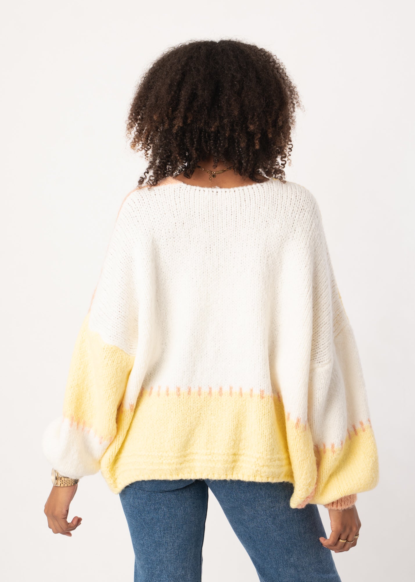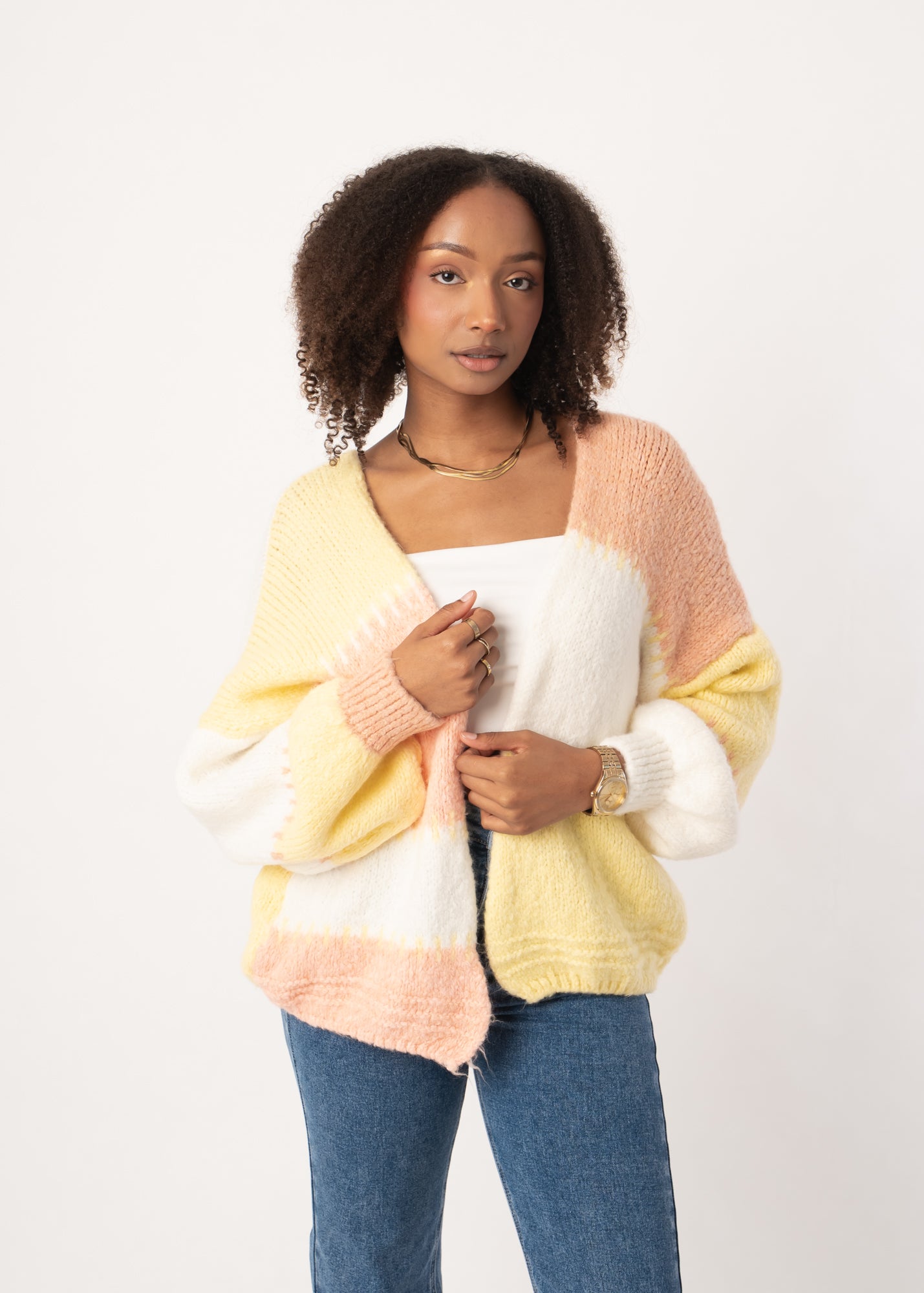 Dieser Cardigan bringt sofort gute Laune in deinen Alltag. Das farbenfrohe Patchwork-Design wirkt modern und verspielt, während der lockere Oversize-Schnitt für ein entspanntes Tragegefühl sorgt. Das weiche Strickmaterial macht ihn super gemütlich und perfekt zum Überwerfen, ob zu Jeans, Kleid oder für einen cozy Home-Look.