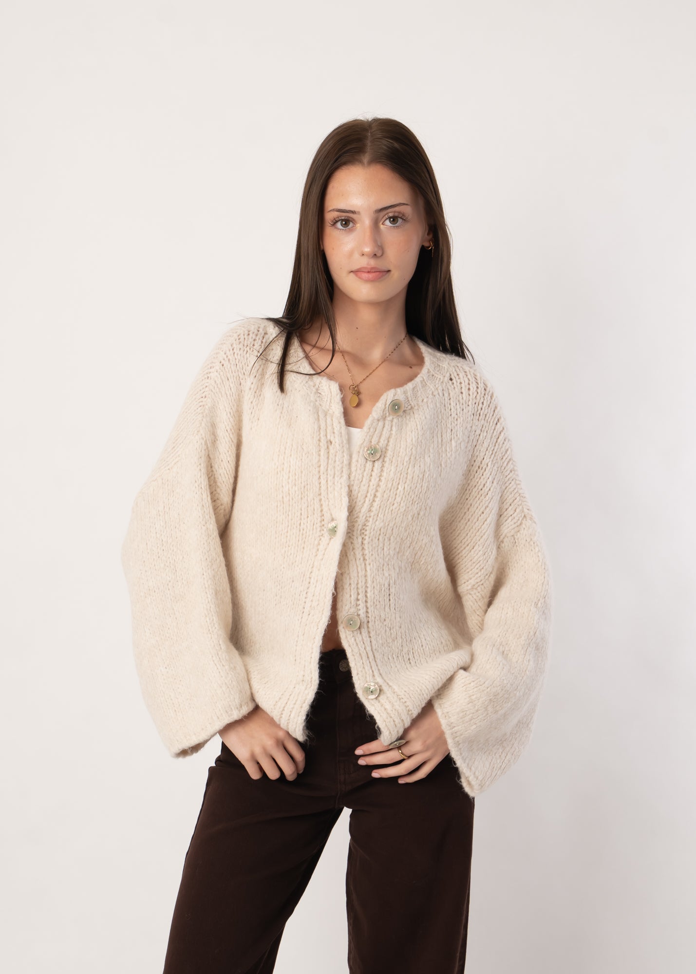Diese Strickjacke vereint Komfort und modernen Look in einem. Der kastige Oversize-Schnitt sorgt für eine entspannte Passform, während die großen Knöpfe einen lässigen Retro-Touch verleihen. Das weiche Strickmaterial macht sie zum perfekten Begleiter für gemütliche Tage und stylische Layering-Looks.