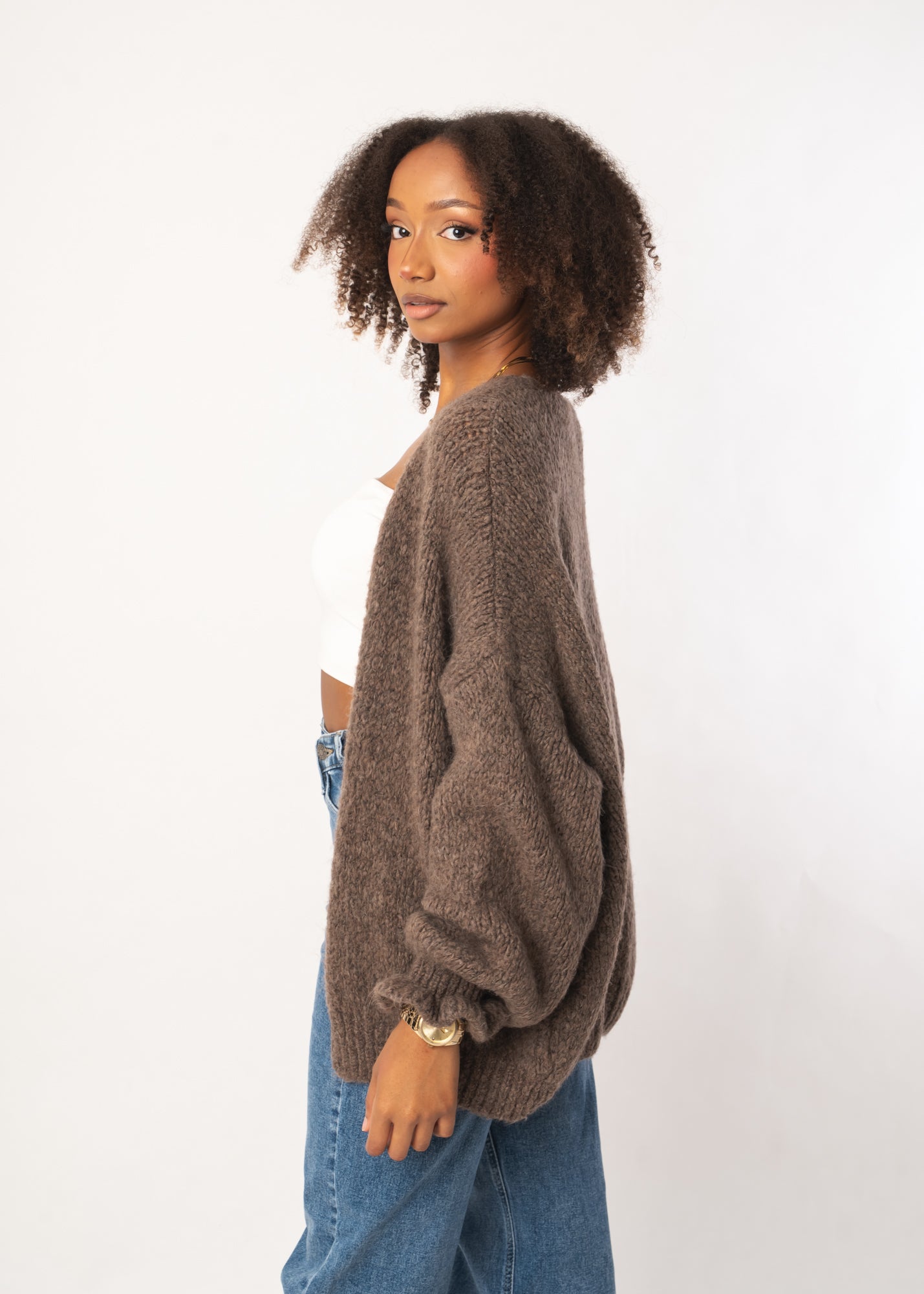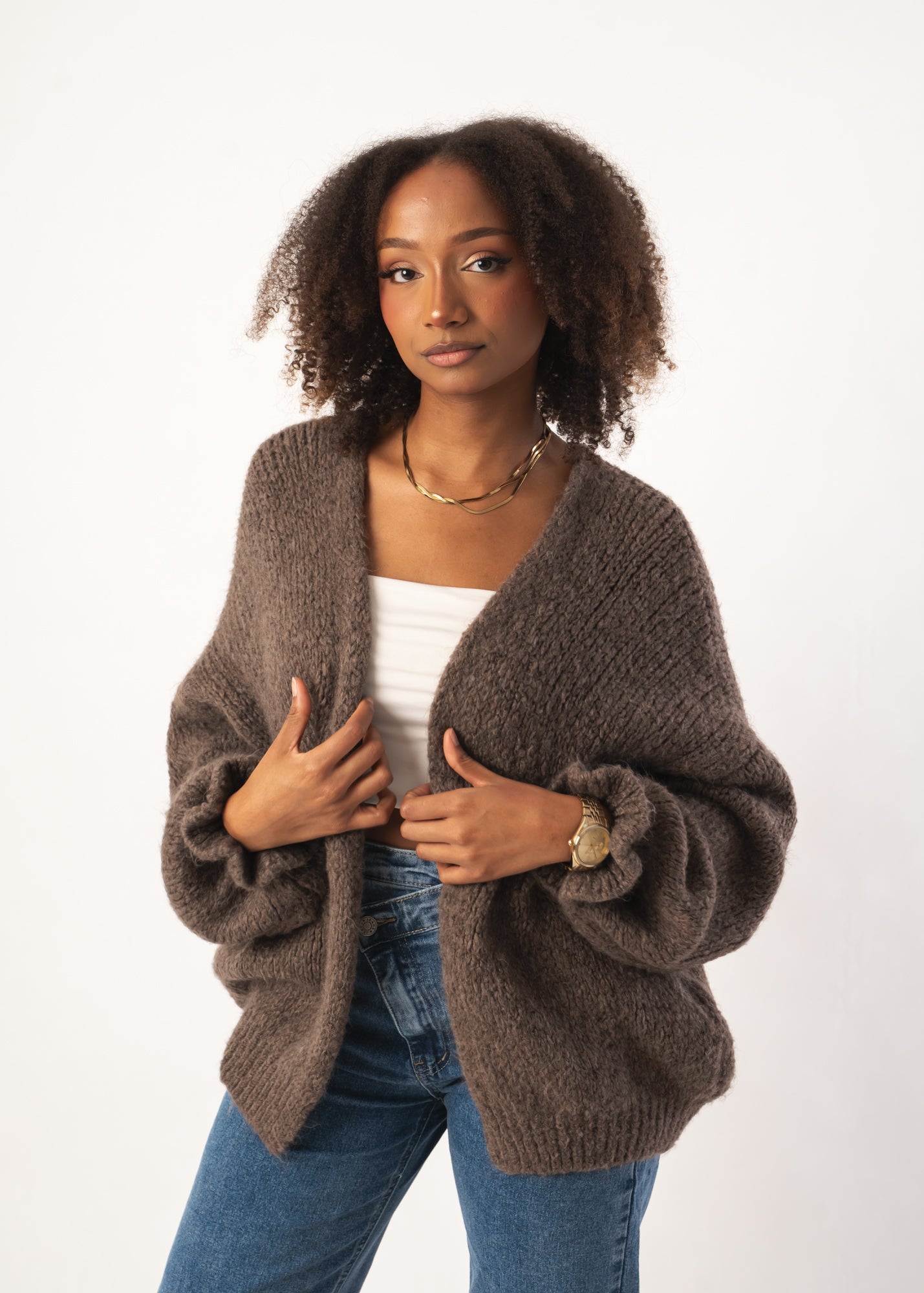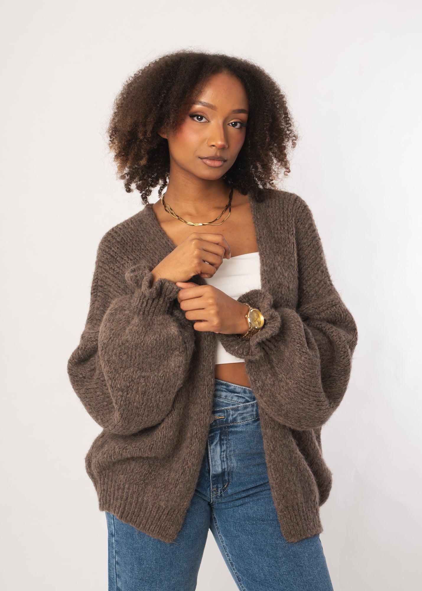 Diese offene Strickjacke bringt Leichtigkeit in deinen Alltag und verleiht jedem Outfit eine gemütliche Note. Mit ihrem oversized Schnitt und den verspielten Rüschenärmeln kombiniert sie Komfort mit einem modernen, femininen Touch – perfekt zum Überwerfen an kühleren Tagen.