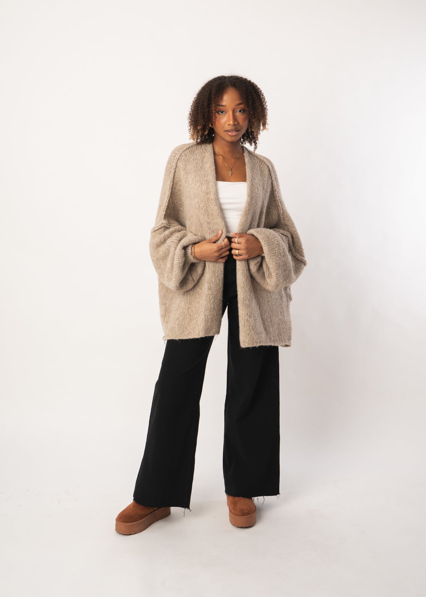Mit weicher Textur, lockerem Oversize-Schnitt und stylischen Außennähten passt sich dieser offene Cardigan vielseitig an verschiedene Größen an und verleiht jedem Look entspannte Modernität
