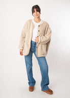 Diese Oversize Teddyjacke ist das perfekte Piece für alle, die es warm und cozy mögen. Das flauschige Bouclé-Material trifft auf einen lockeren Schnitt und praktische Details wie Knopfleiste und Taschen – so wird sie schnell zu deinem neuen Lieblingsbegleiter. Ob casual zu Jeans oder als softer Eyecatcher über Kleidern, diese Jacke lässt sich vielseitig kombinieren und rundet jeden Look ab.