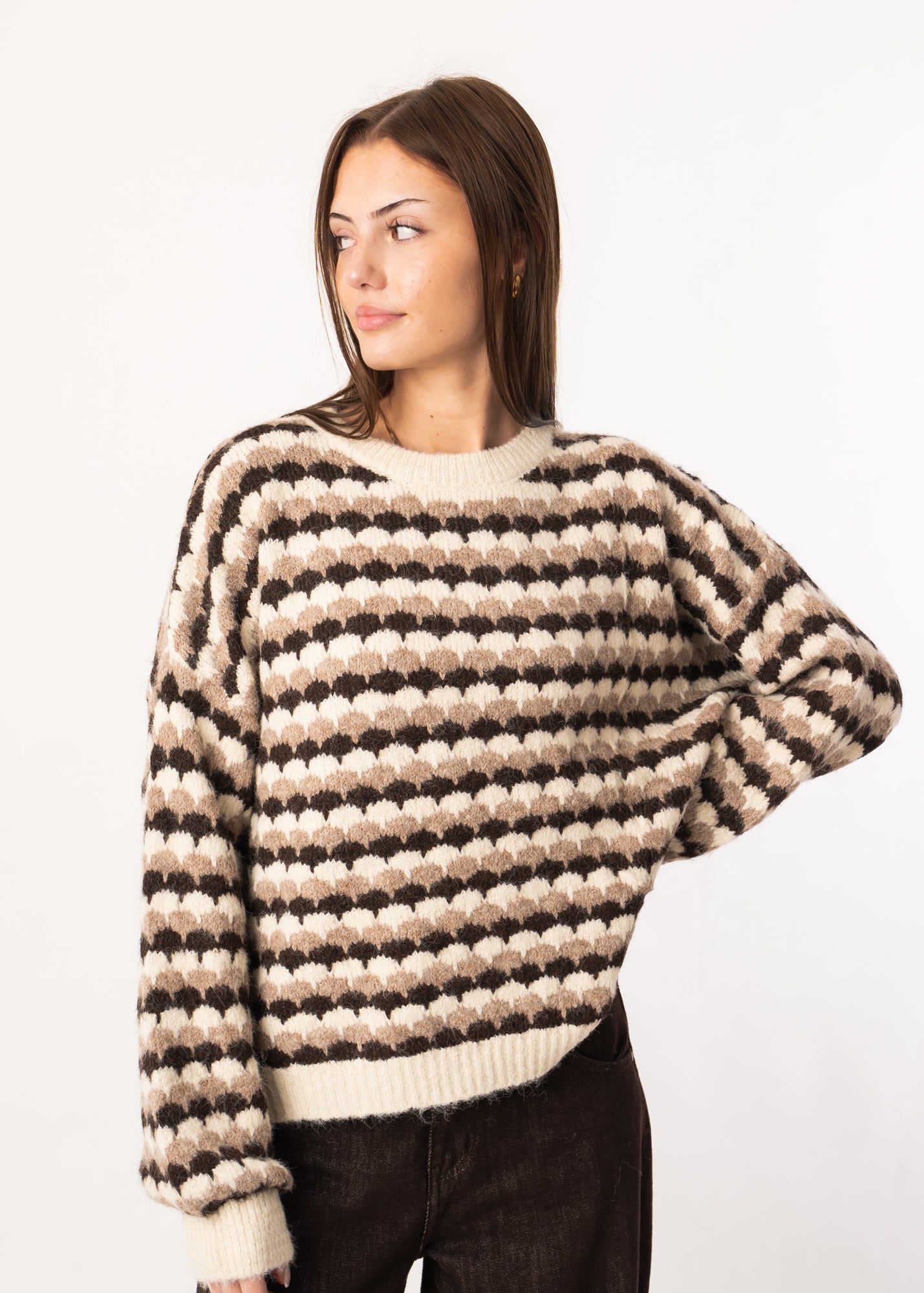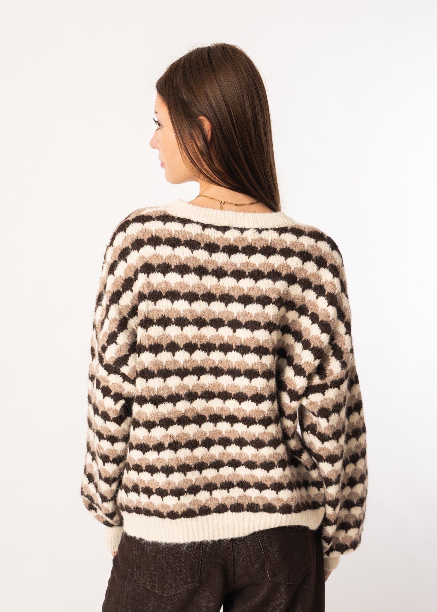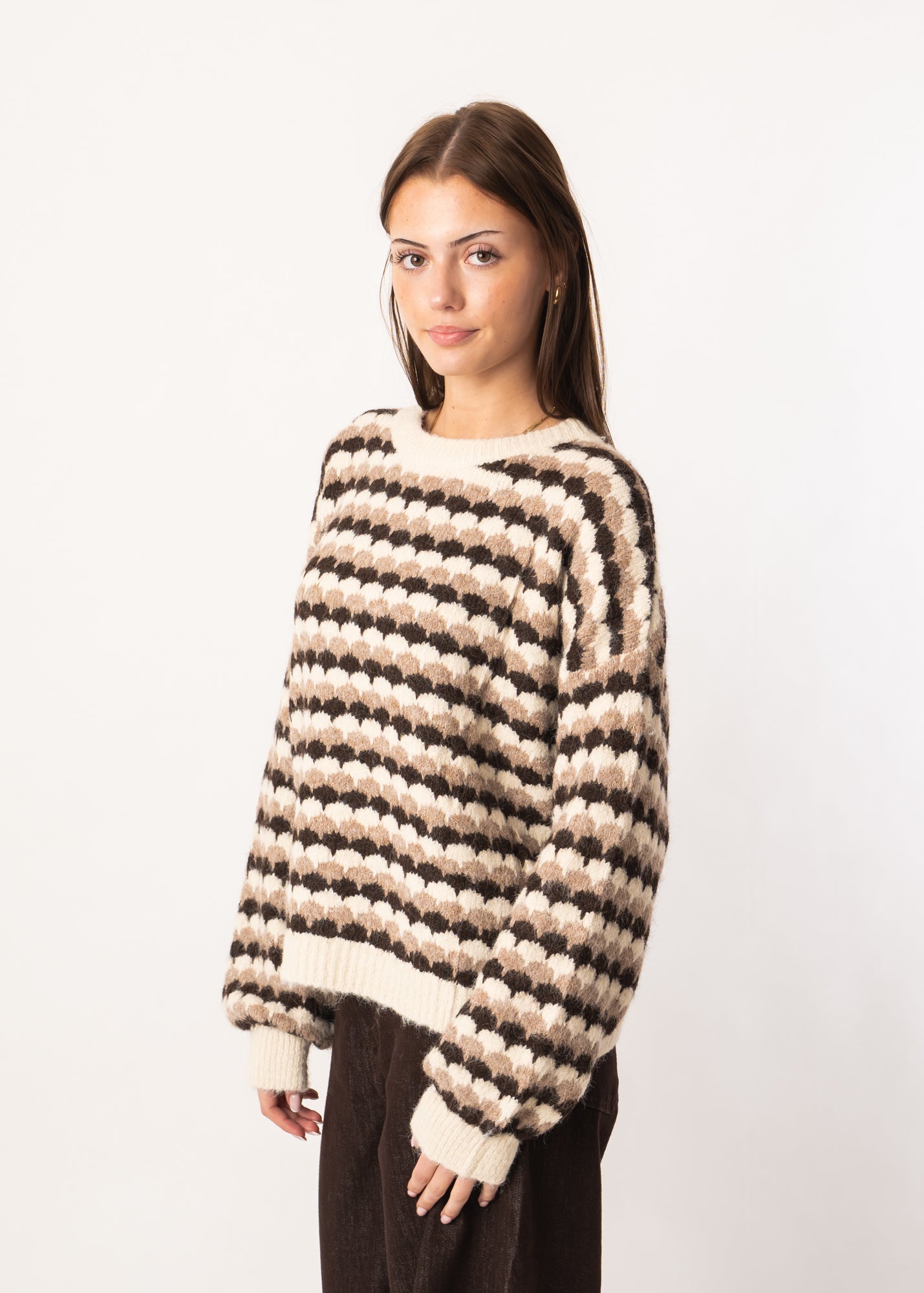 Der Wavy Sweater überzeugt mit seinem auffälligen Wellenmuster und dem weichen Strickmaterial, das sofort ein cozy Gefühl verleiht. Der lockere Schnitt sorgt für einen entspannten Sitz und macht ihn zum idealen Everyday-Piece – stylisch, warm und perfekt für die kühle Jahreszeit.