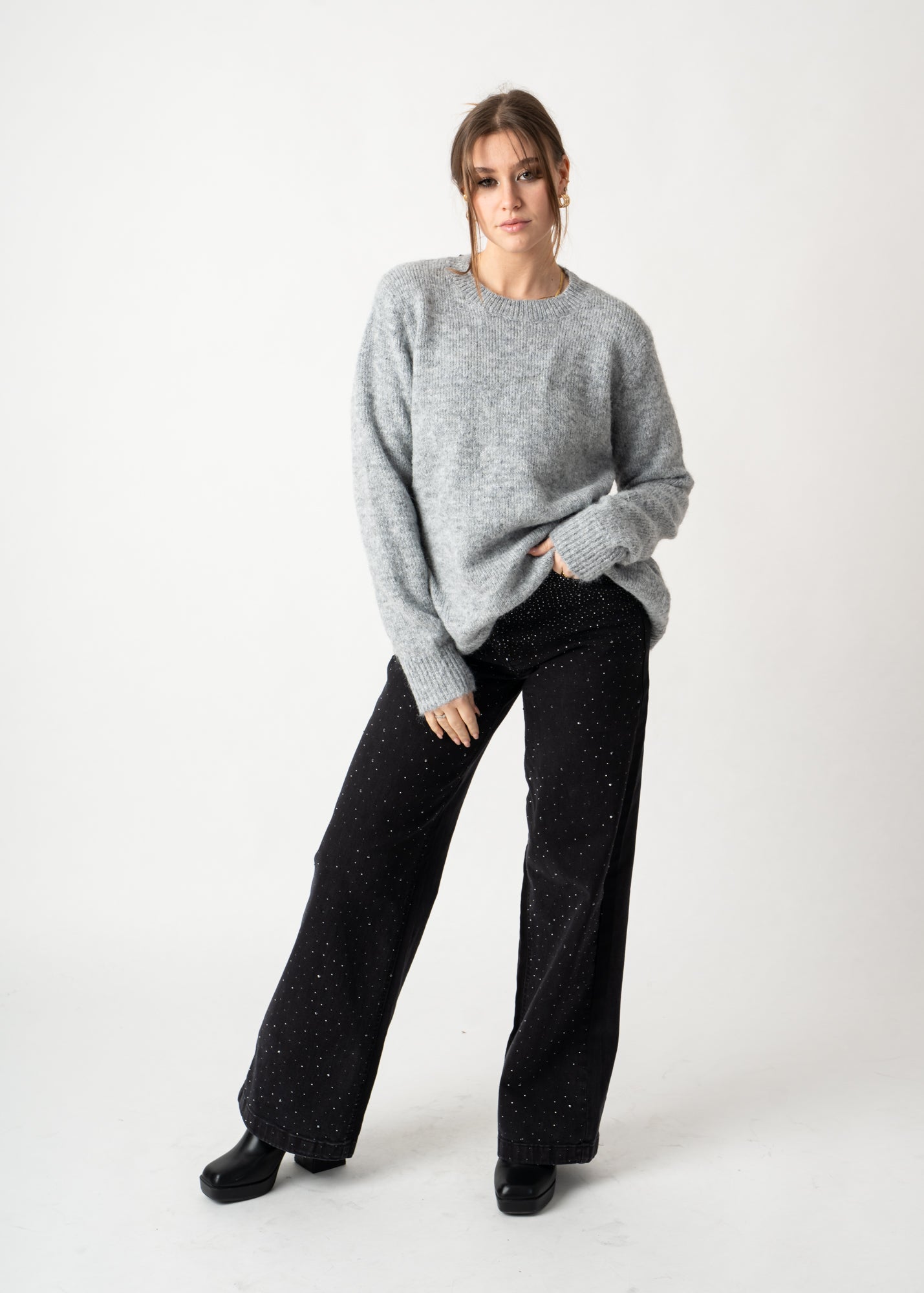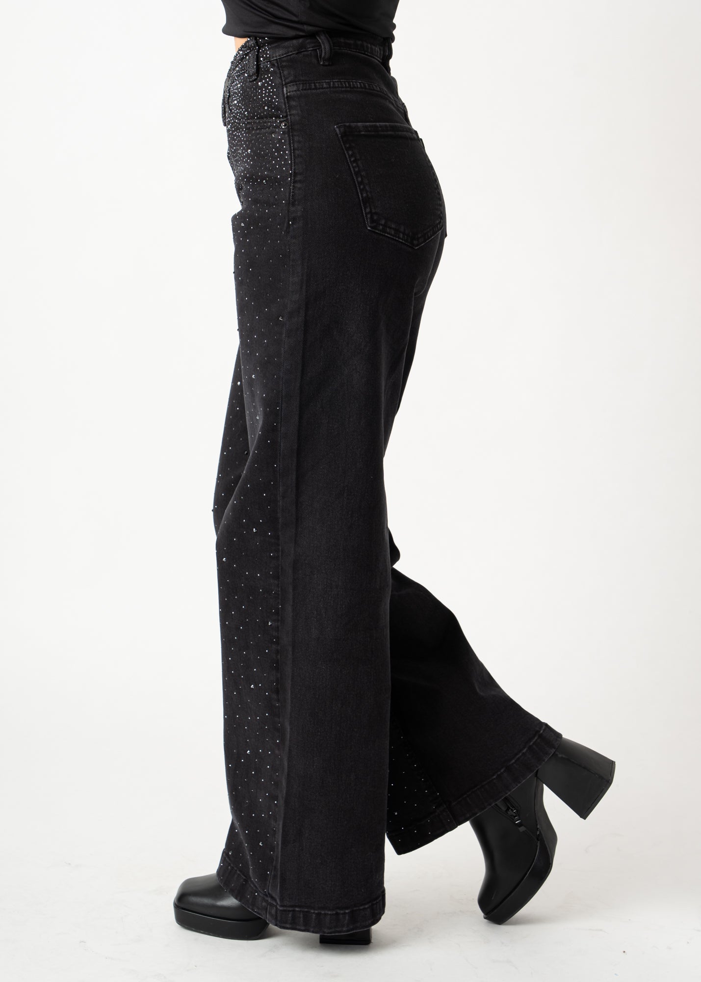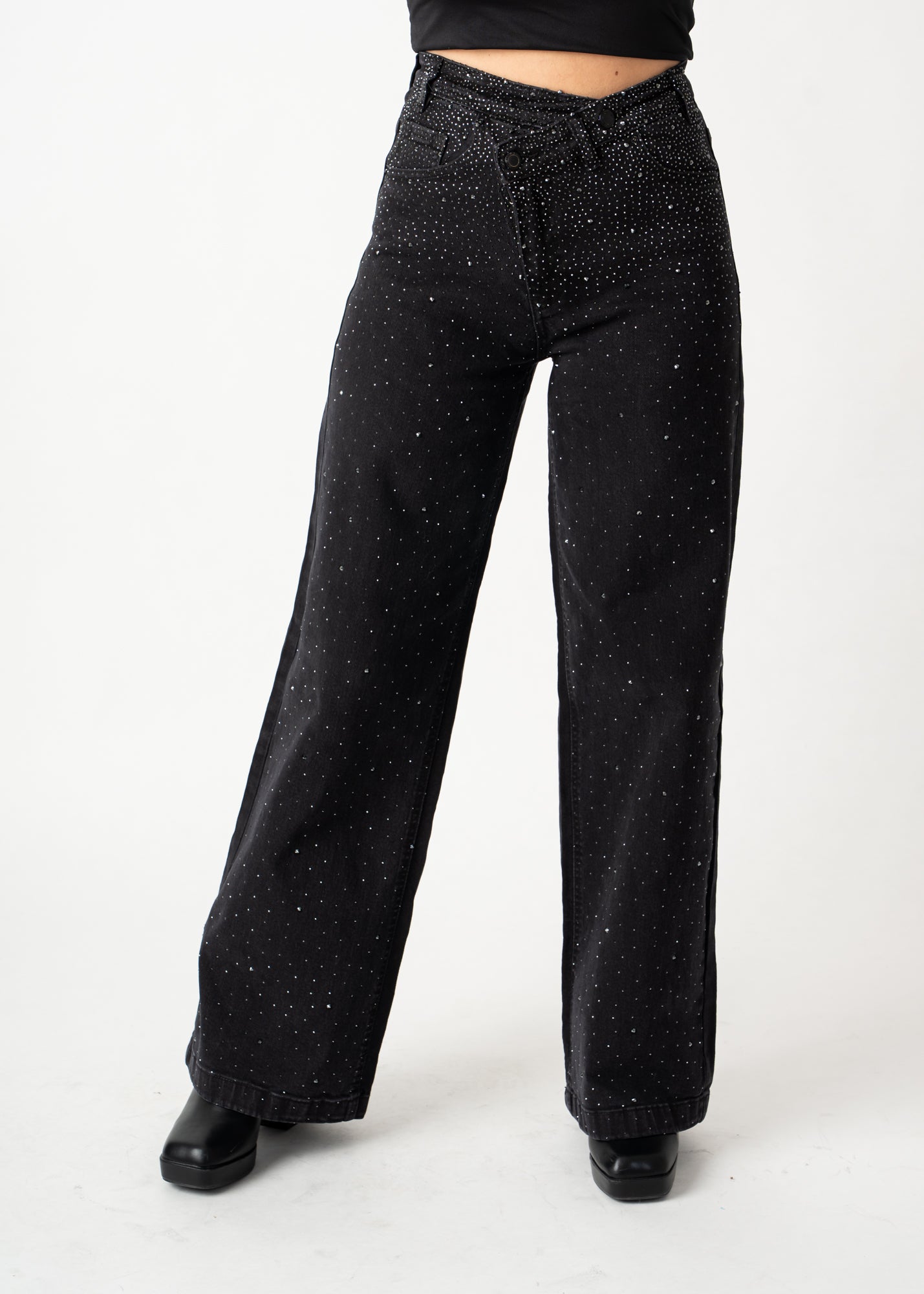 Eine schwarze Jeans mit feinem Strass der bei jeder Bewegung dezent funkelt. Der lockere gerade Schnitt sorgt für einen entspannten Fit während das schimmernde Finish den Look sofort party ready macht. Perfekt für Abendlooks Silvester oder wenn eine Jeans mehr Statement sein soll.