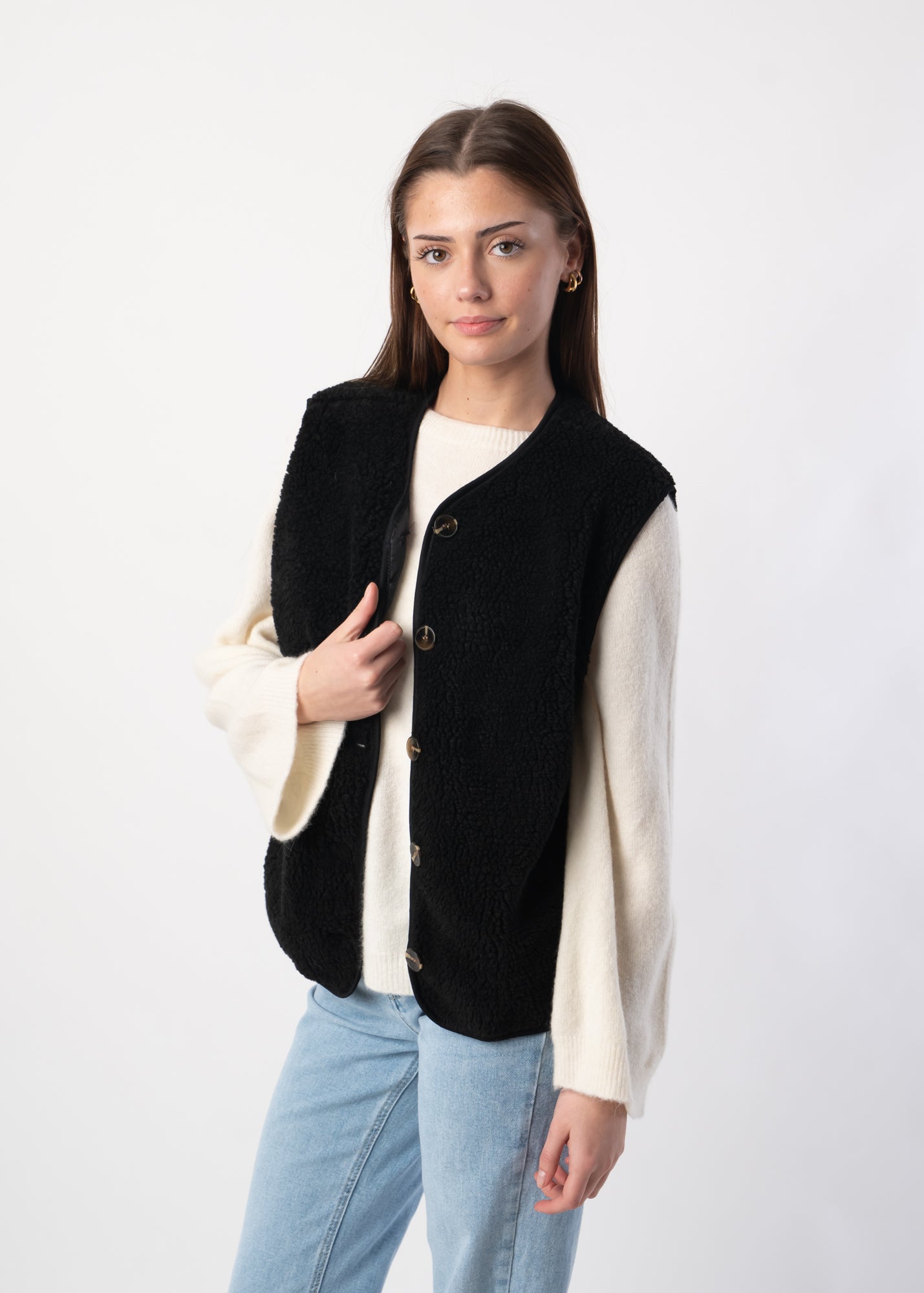 Diese leichte Teddyweste sorgt für einen weichen, entspannten Look und ist perfekt für den Frühling. Kombiniert mit unserem Feinstrickpullover entsteht ein gemütliches Outfit für jeden Tag.
