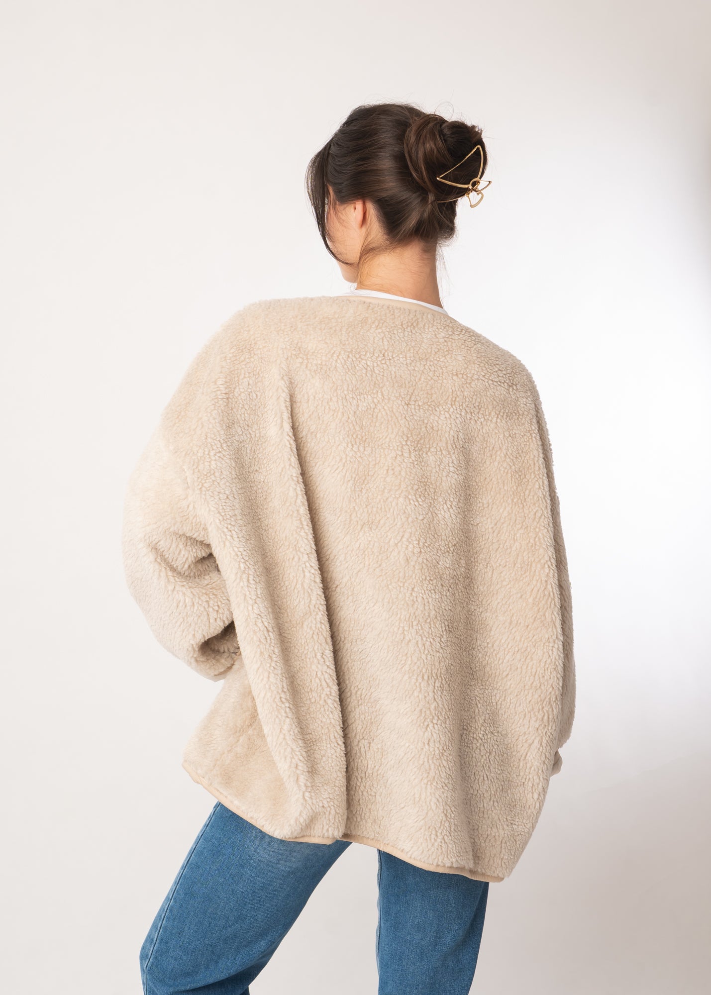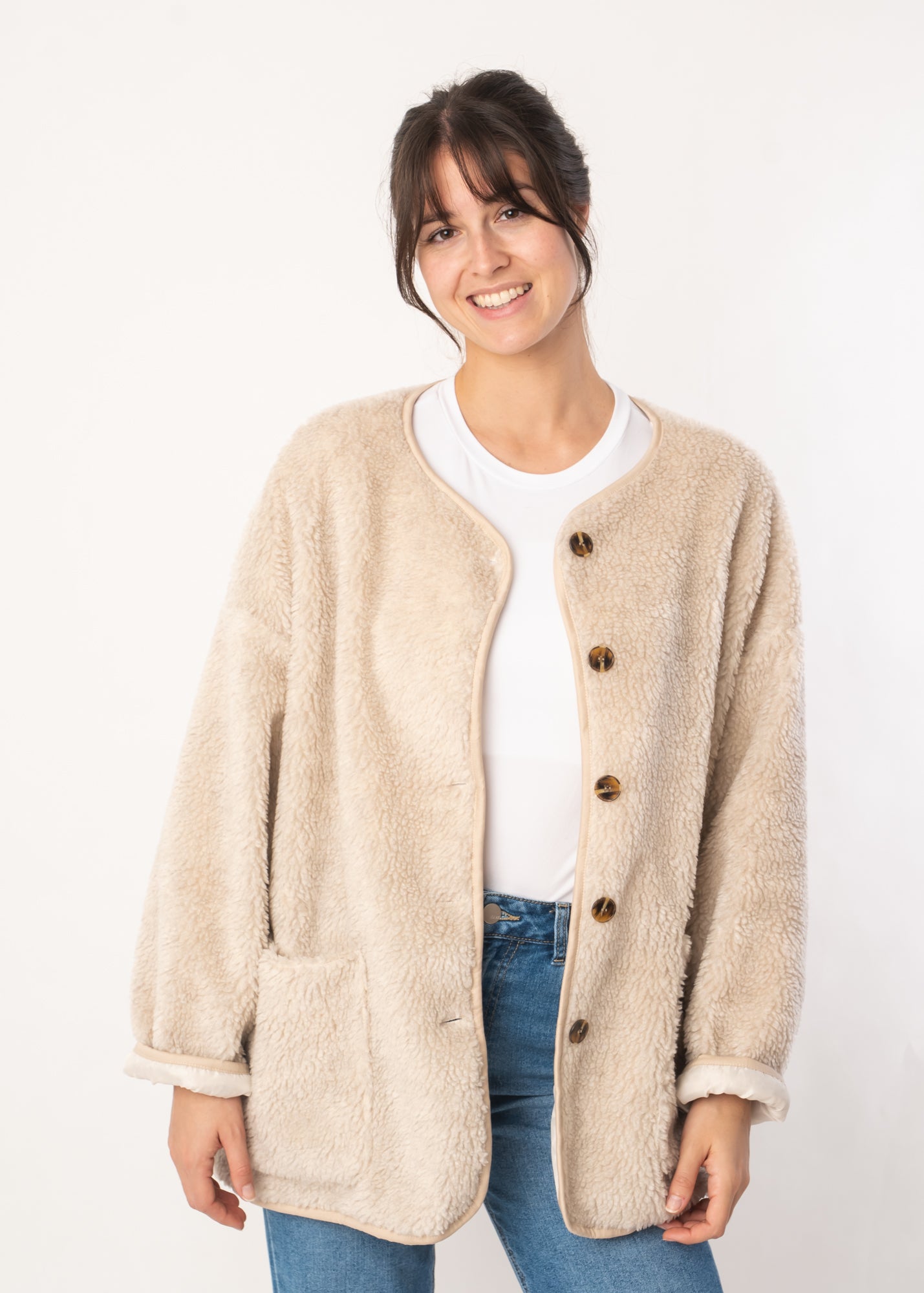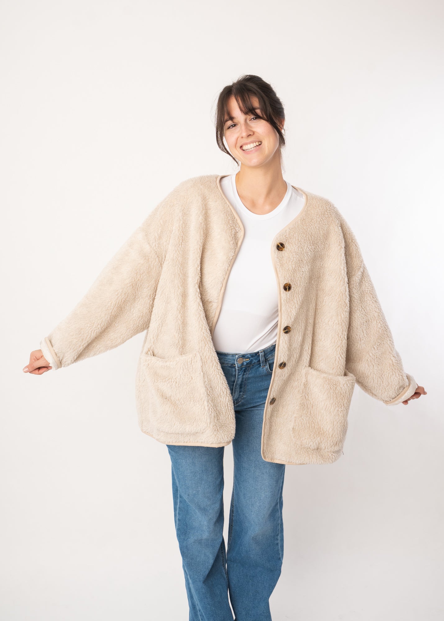 Diese Oversize Teddyjacke ist das perfekte Piece für alle, die es warm und cozy mögen. Das flauschige Bouclé-Material trifft auf einen lockeren Schnitt und praktische Details wie Knopfleiste und Taschen – so wird sie schnell zu deinem neuen Lieblingsbegleiter. Ob casual zu Jeans oder als softer Eyecatcher über Kleidern, diese Jacke lässt sich vielseitig kombinieren und rundet jeden Look ab.