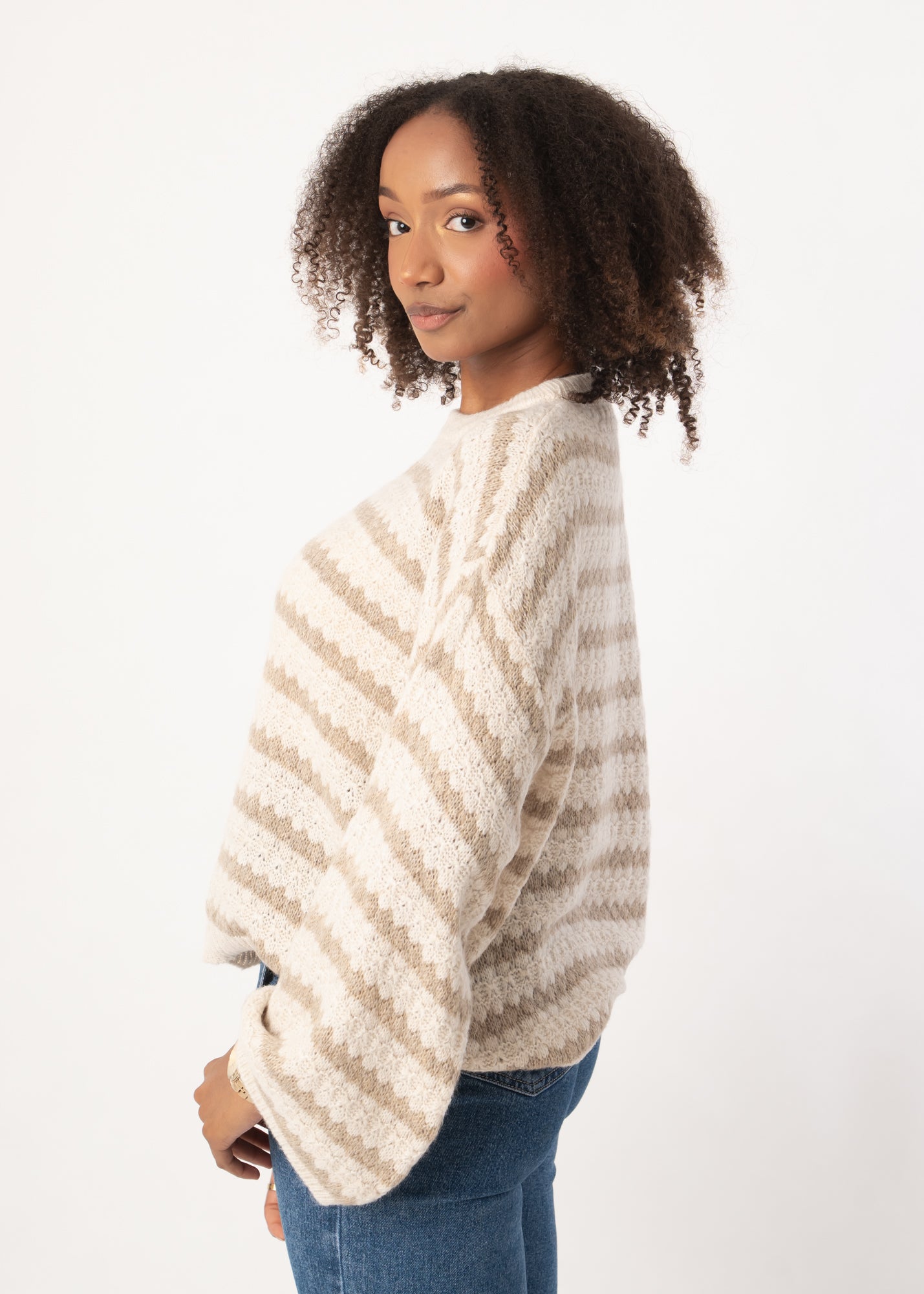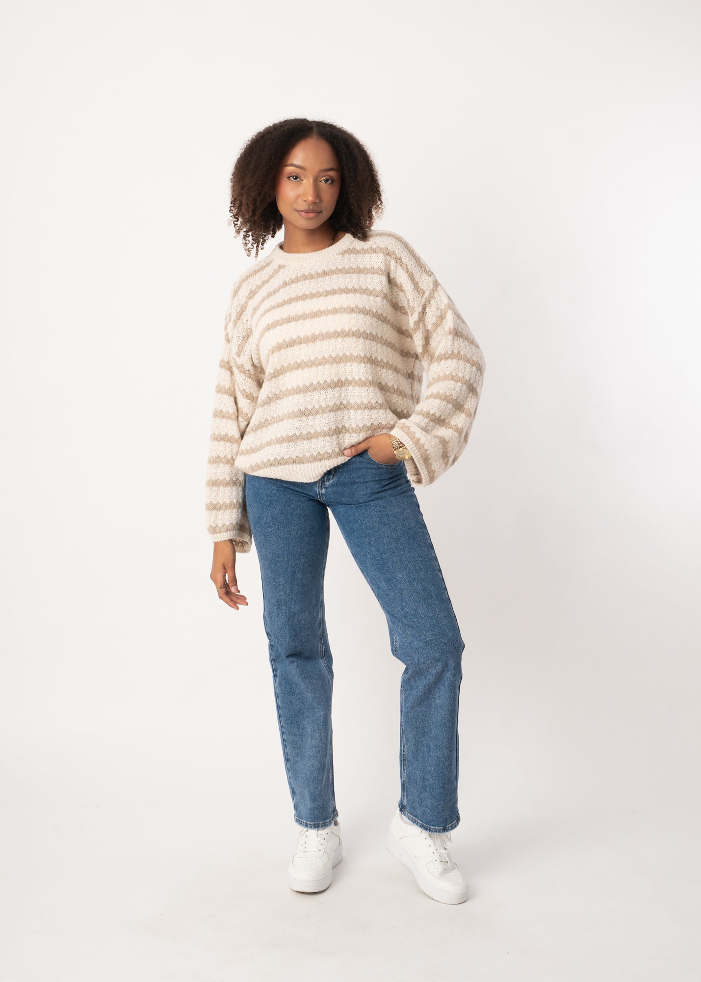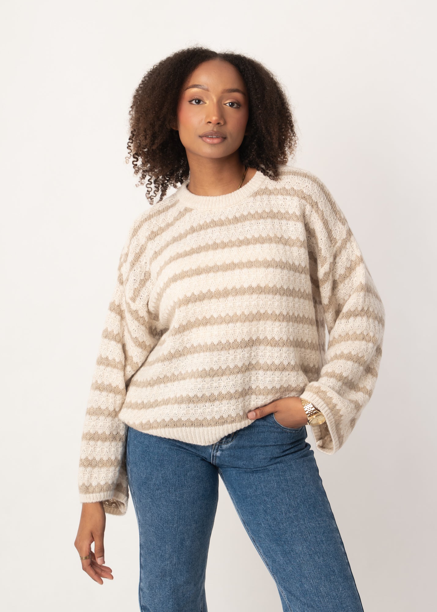 Dieser Oversize-Strickpullover bringt mit seinen markanten Streifen einen modernen Twist in deinen Look. Die weiten Ärmel und das lockere Design sorgen für ein entspanntes Tragegefühl und machen ihn zum perfekten Begleiter für kühle Tage. Das weiche Strickmaterial fühlt sich angenehm auf der Haut an und lässt sich easy kombinieren, von Jeans bis Rock.